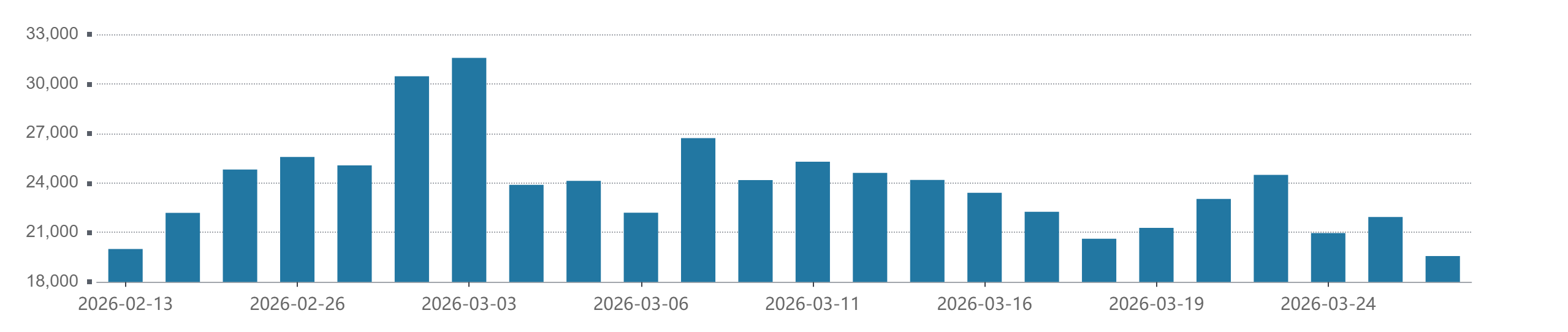 Wind资料显示,时隔22个交易日后,A股成交额再次降至2万亿元下方。3月26日,市场成交额为1.96万亿元。